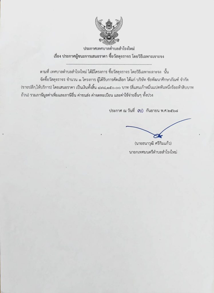 ประกาศ ผู้ชนะการเสนอราคา ซื้อวัสดุจราจร โดยวิธีเฉพาะเจาะจงBy admin / 30 กันยายน 2568 จำนวนผู้เข้าชม : 15