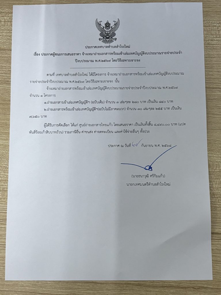 ประกาศ ผู้ชนะการเสนอราคา จ้างเหมาเครื่องถ่ายเอกสารพร้อมเข้าเล่มเทศบัญญัติงบประมาณรายจ่ายประจำปี งบประมาณ 2569 โดยวิธีเฉพาะเจาะจงBy admin / 29 กันยายน 2568 จำนวนผู้เข้าชม : 15